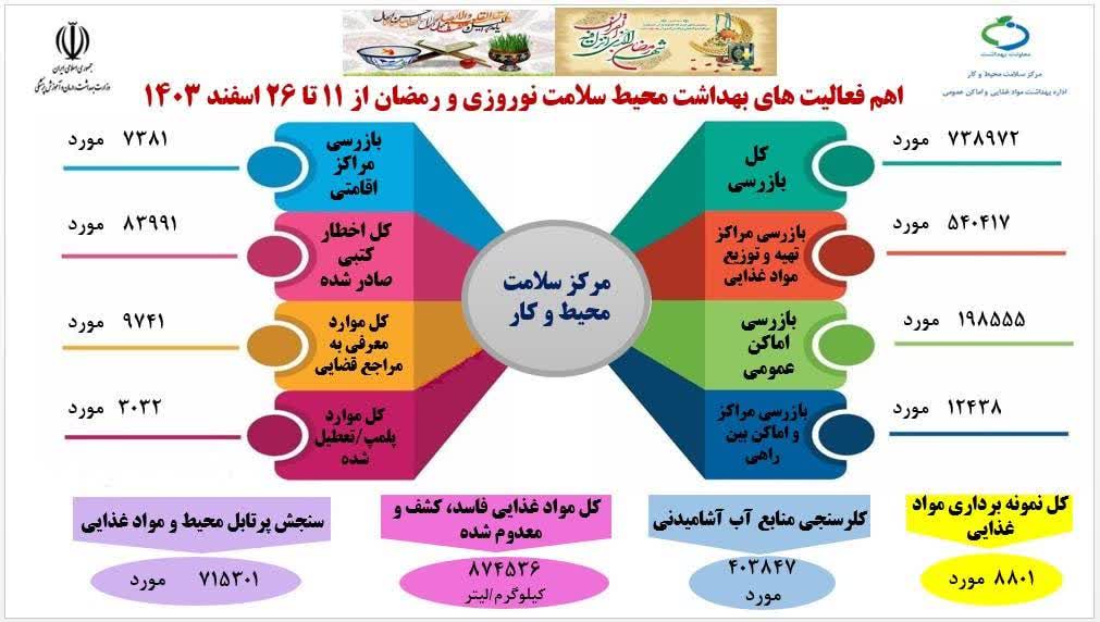 سلامت نوروزی و رمضان 1403/12/28 - 10:35 - تعداد بازدید: 138 - تعداد بازدیدکننده: 138 - کد خبر : 2969 - گروه خبری : اخبار معاونت - تعداد نظرات : 0 اهم فعالیت های بهداشت محیط سلامت نوروزی و رمضان از 11 تا 26 اسفندماه 1403 انجام بیش از 738 هزار مورد بازرسی بهداشت محیط