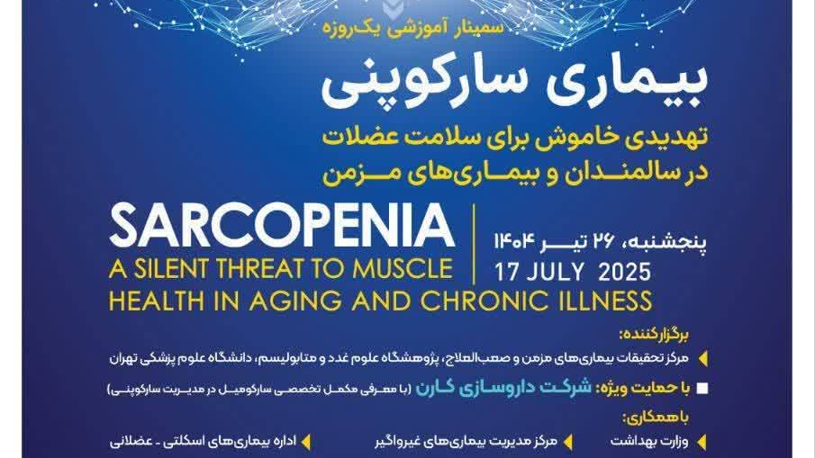 نخستین سمینار علمی–آموزشی بیماری سارکوپنی با تمرکز بر تشخیص، پیشگیری و مداخلات تغذیه‌ای و درمانی، روز پنج‌شنبه ۲۶ تیر ۱۴۰۴ از ساعت ۸ تا ۱۳ در سالن همایش‌های ستاد مرکزی دانشگاه علوم پزشکی تهران برگزار خواهد شد.