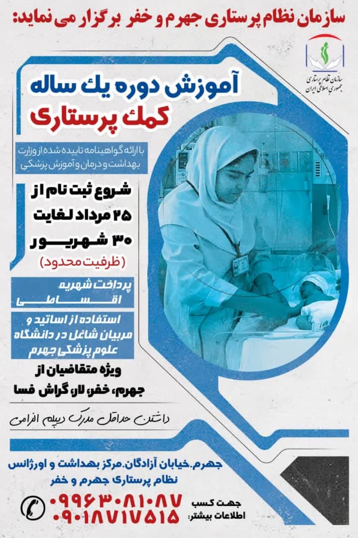 سازمان نظام پرستاری کشوری با تایید وزارت بهداشت و درمان و آموزش پزشکی مهلت ثبت نام تا 30 شهریور جهت ثبت نام ...جهرم.خیابان آزادگان.جنب ساختمان بهداشت و اورژانس.