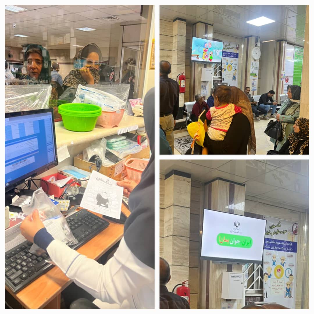 پخش محتواهای آموزشی جوانی جمعیت در سالن انتظار بیمارستان خاتم الانبیا شهرستان خفر و توزیع تراکت معرفی مرکز نفس(مشاوره نجات فرزندان سقط) به همراه نسخه های مراجعین داروخانه ی بیمارستان.