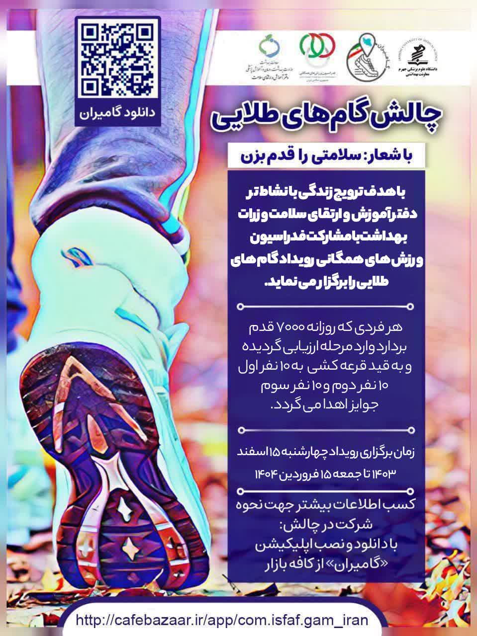 دفتر آموزش و ارتقای سلامت وزارت بهداشت با مشارکت فدراسیون ورزش های همگانی رویداد گام طلایی را باهدف مشارکت کارکنان دانشگاه ،ادارات ،داوطلبان و سفیران سلامت و آحاد مردم برگزار میکند.