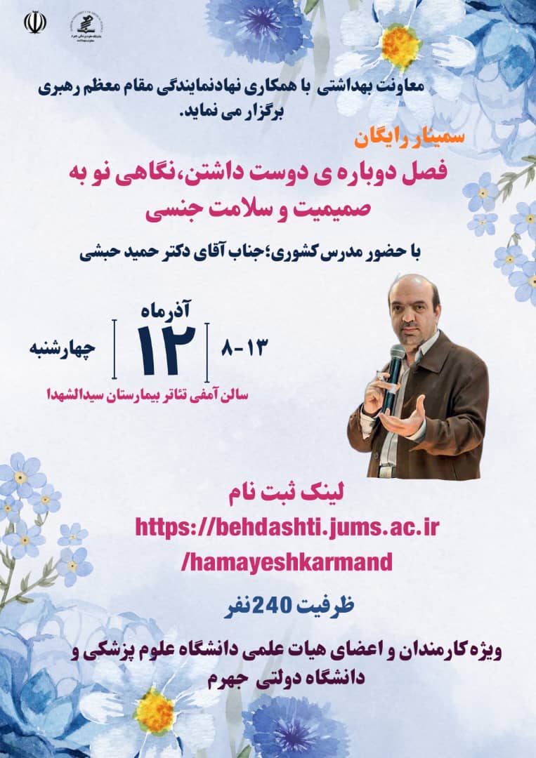 به گزارش وبدا جهرم، این سمینار آموزشی با عنوان «نگاهی نو به صمیمیت و سلامت جنسی» و با حضور مدرس مطرح کشوری، دکتر حمید حبشی برگزار می‌شود.