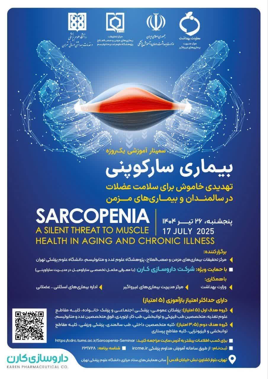 نخستین سمینار علمی–آموزشی بیماری سارکوپنی با تمرکز بر تشخیص، پیشگیری و مداخلات تغذیهای و درمانی، روز پنجشنبه ۲۶ تیر ۱۴۰۴ از ساعت ۸ تا ۱۳ در سالن همایشهای ستاد مرکزی دانشگاه علوم پزشکی تهران برگزار خواهد شد.