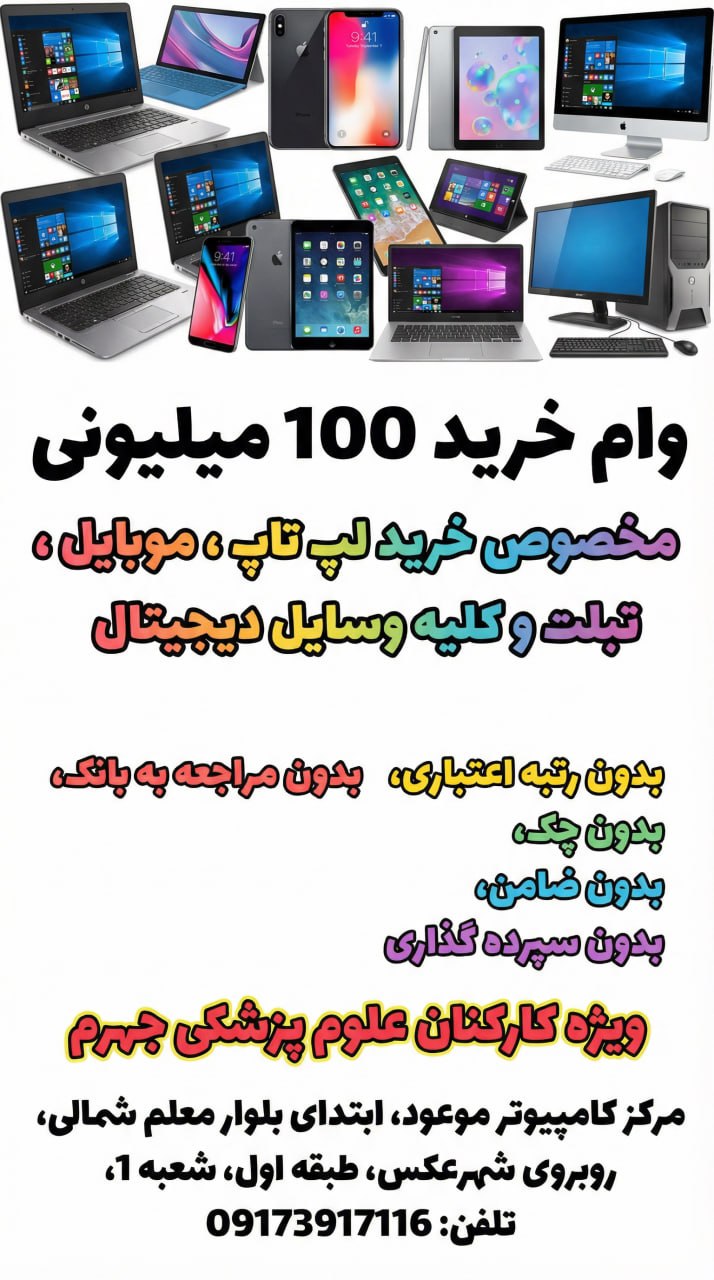 وام خرید 100 میلیونی (مخصوص خرید لپ تاپ ، موبایل ، تبلت و کلیه وسایل دیجیتال ) بدون رتبه اعتباری ، بدون مراجعه به بانک، بدون چک، بدون ضامن و بدون سپرده گذاری ویژه کارکنان علوم پزشکی جهرم