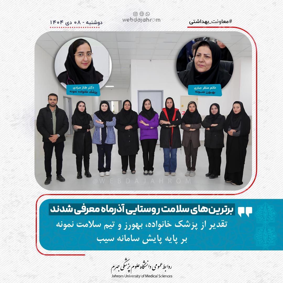 همزمان با اجرای برنامه پایش‌های هفتگی شاخص‌های سلامت مبتنی بر داده‌های سامانه سیب در آذرماه، از تلاش‌های اثربخش فعالان برتر حوزه سلامت روستایی تحت پوشش دانشگاه علوم پزشکی جهرم تقدیر شد.