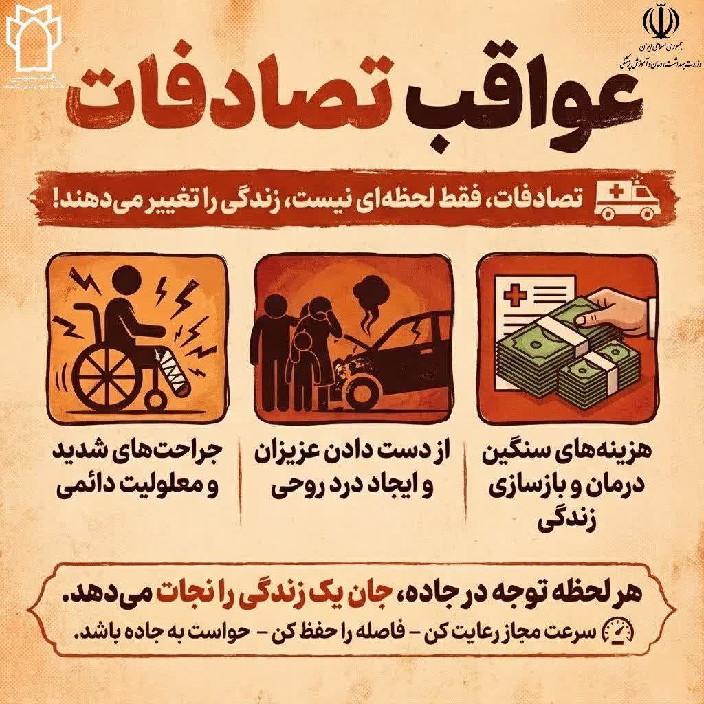 نه به تصادف 1404/10/17 - 08:29 - تعداد بازدید: 15 - تعداد بازدیدکننده: 14 - کد خبر : 4477 - گروه خبری : گزارش تصویری,رویداد - تعداد نظرات : 0 تصادفات زندگی ها را تغییر می دهند هر لحظه توجه به جاده، جان یک زندگی را نجات می دهد نه به تصادف