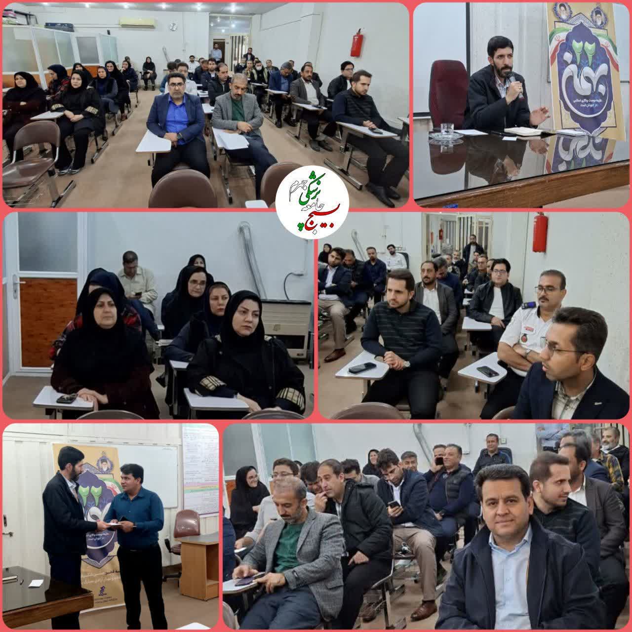 این برنامه با حضور کارکنان و بسیجیان معاونت بهداشت و مرکز اورژانس و با سخنرانی مدیر بسیج جامعه پزشکی برگزار و مباحث ذیل در قالب جهاد تبیین ارائه گردید ؛